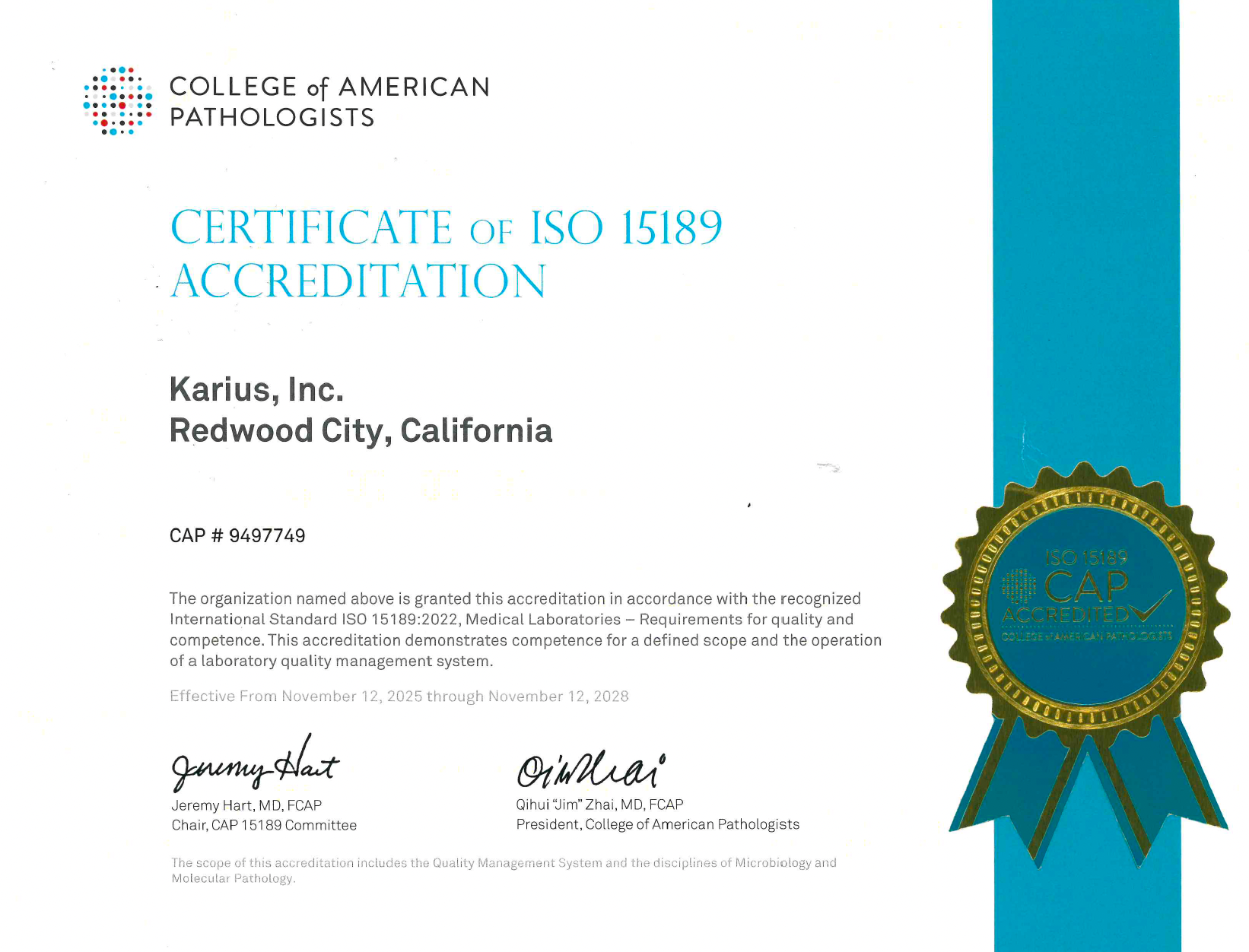 | Certificate of ISO 15189 Accreditation | 9497749 | 11/12/2028 |