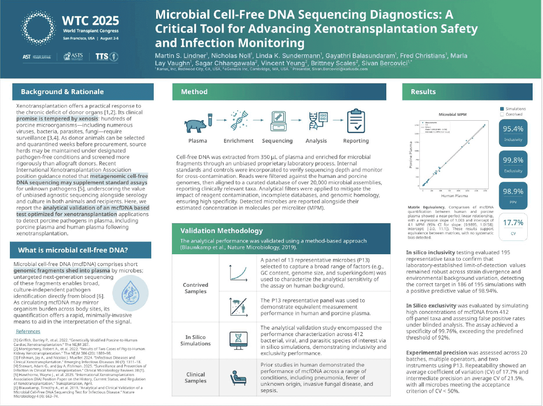 A modified version of the Karius Test was first applied in the landmark genetically modified pig-to-human heart transplant published in The New England Journal of Medicine1, with a subsequent case analysis in The Lancet underscoring the infectious disease considerations and viral monitoring challenges associated with clinical xenotransplantation2. publications highlight the potential value of incorporating metagenomic sequencing for xenotransplantation.3,4