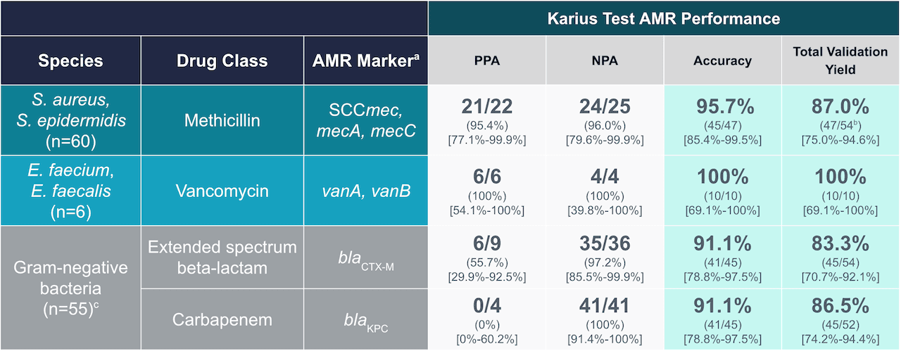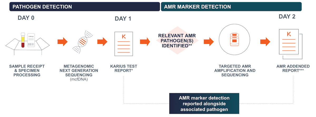 The Karius SpectrumTM test, a minimally invasive liquid biopsy for infectious diseases, is the first commercially available plasma based, culture-independent test with AMR marker detection, designed to help clinicians use targeted therapy to help improve patient outcomes. AMR capabilities include detection of antimicrobial resistance for 18 bacterial pathogens and 4 classes of antimicrobial resistance: