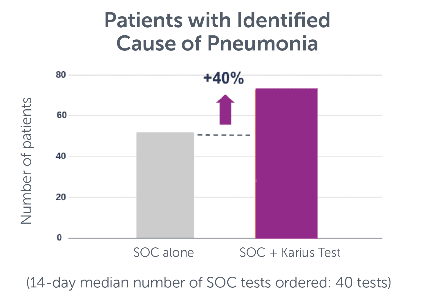 In a prospective, multi-center study enrolling over 173 adult patients with suspected pneumonia, a 40% (21/52) relative increase in the cause of pneumonia identified when the Karius Spectrum test was used in conjunction with standard of care (SOC) testing.**,6