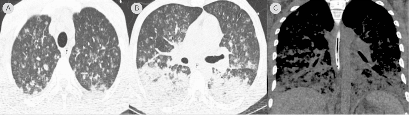 (A) CT chest axial lung window showing miliary changes in both lungs; (B) CT chest axial lung window showing several nodules with developing central cavitation and bilateral consolidation; (C) coronal window showing bibasilar airspace disease with confluent consolidation throughout the lung bases5