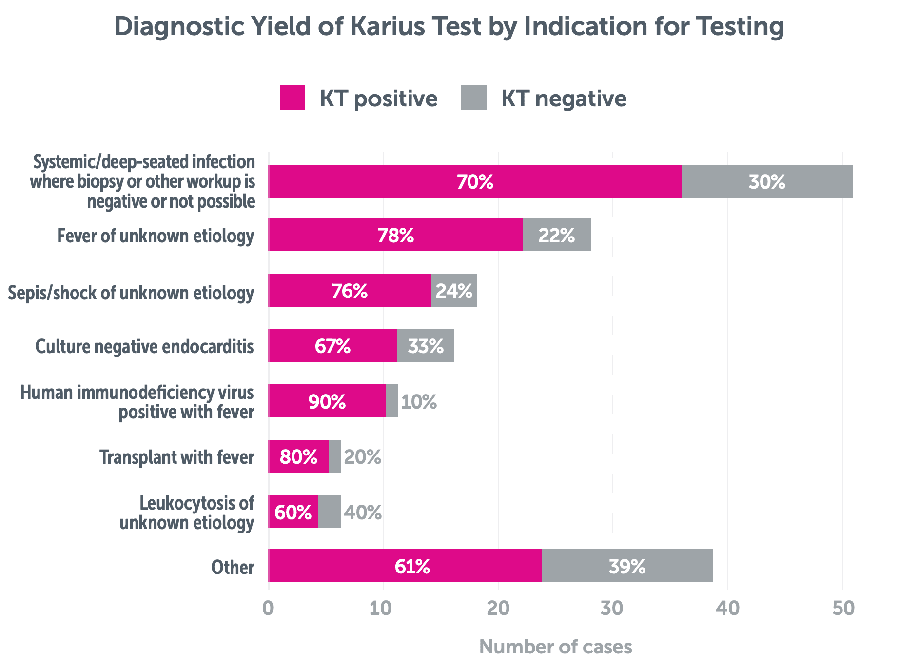 In a retrospective study of 167 adult, hospitalized patients, where 55 patients presented with ‘fever of unclear etiology’, use of the Karius Spectrum test led to a change in antimicrobial management in 76% (120/167) of cases.